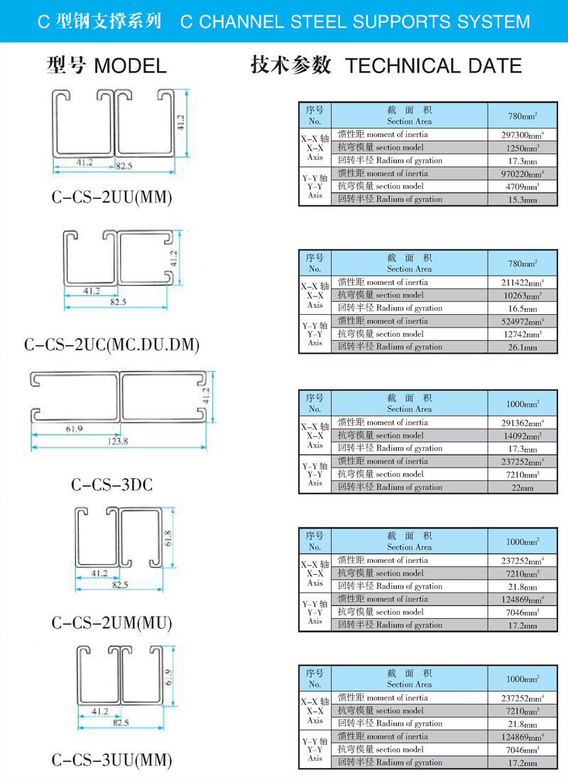 C型钢支撑系列是我公司引进国外先进技术工艺, 新开发的产品。具有结构合理、安装灵括、强度可靠等优点。可任意调节支撑的高度及问距。适合于电缆桥架、通风管道等各种患挂、吊装设备的安装 。