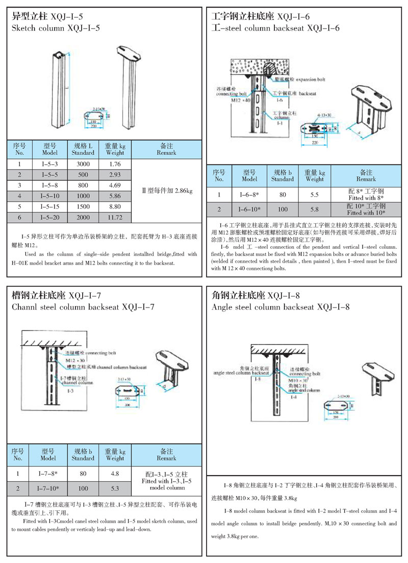 支架是支撑电缆桥架和电缆的主要部件。它由立柱、立柱底座、托宵等组成 。它具有结构简单、重量轻、强度大、造型美、安装灵活、可满足不同环境条件(工艺管道下、楼板下、墙壁上、电缆沟内)和不同形式(悬吊式、直立式、 侧立式、单边、双边和多层等)的安装 。