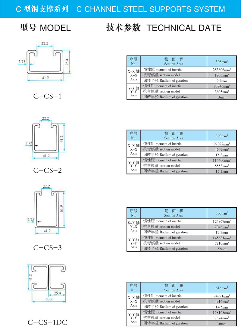 C型钢支撑系列是我公司引进国外先进技术工艺, 新开发的产品。具有结构合理、安装灵括、强度可靠等优点。可任意调节支撑的高度及问距。适合于电缆桥架、通风管道等各种患挂、吊装设备的安装 。